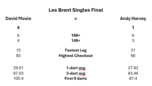 David Moule is soon becoming the player to beat in the Tuesday Night Dart league, and that showed once again in the Les Brant Singles competition.